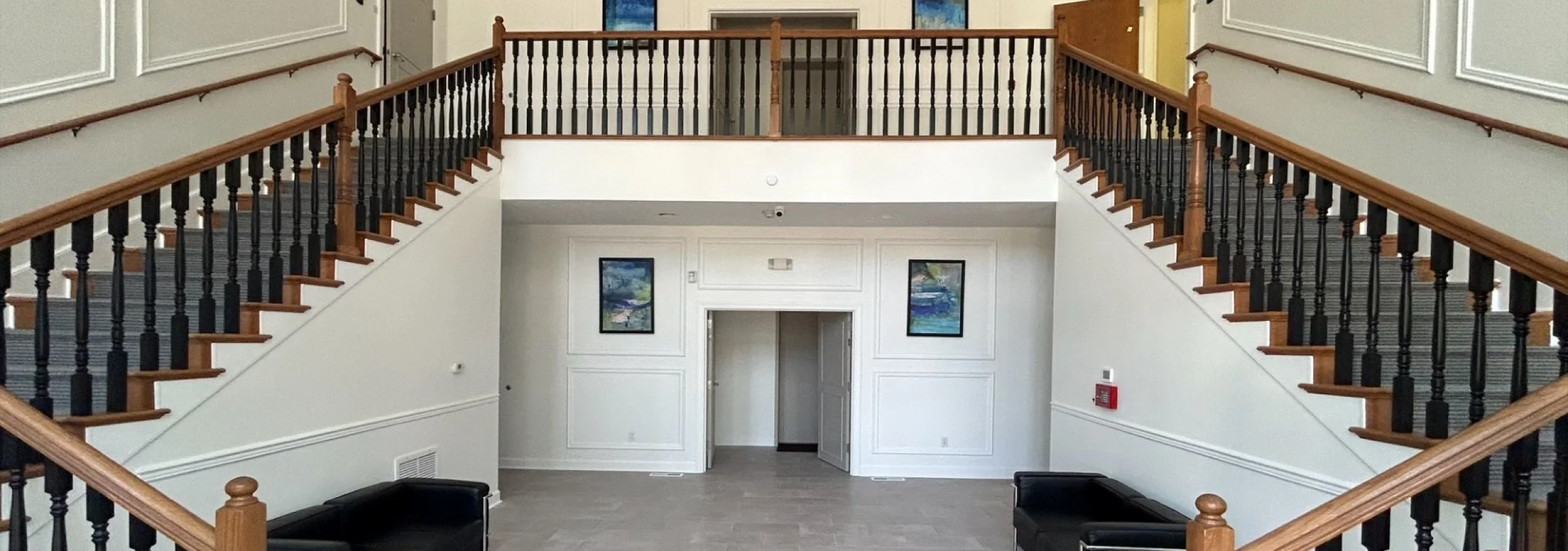WestScott Construction revitalized the outdated lobby of a commercial office at 2650 Apalachee Parkway into a welcoming, upscale space. To enhance the room’s aesthetic, we added wall trim, giving it a more polished and formal appeal. The staircase was updated with new carpeting, the handrails were refinished and repainted and luxury tile was installed for a sophisticated look. Fresh paint brightened the walls, and a stunning chandelier now draws the eye upward, accentuating the high ceilings and adding a touch of sophistication. The newly renovated lobby makes a lasting impression on employees and visitors alike.
